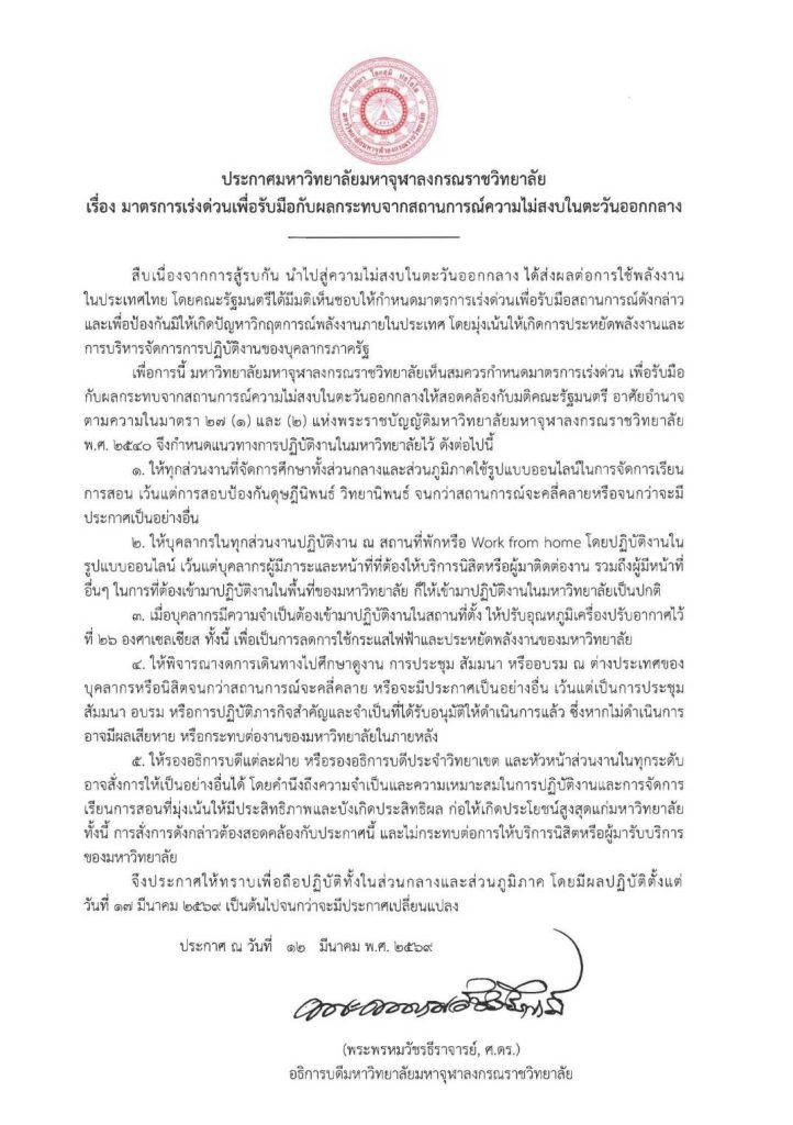ประกาศมหาวิทยาลัย 0 By admin มจร.ชัยภูมิ on 2026-03-23 ข่าวมหาวิทยาลัย W3.CSS ประกาศมหาวิทยาลัยมหาจุฬาลงกรณราชวิทยาลัย เรื่อง มาตรการเร่งด่วนเพื่อรองรับสถานการณ์ความไม่สงบในตะวันออกกลาง การปฏิบัติงานของบุคลากร ณ สถานที่พัก หรือ Work from home Share. Twitter Facebook Google+ Pinterest LinkedIn Tumblr Email